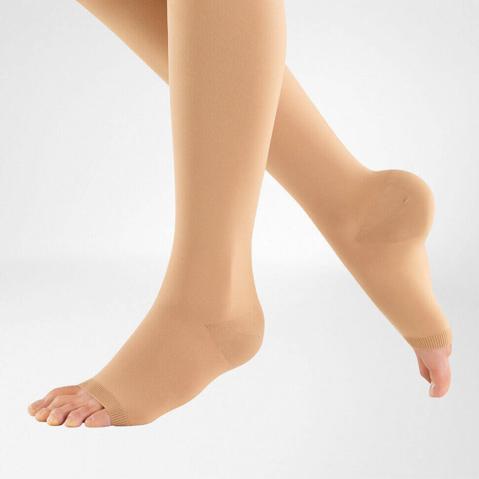 Queste calze terapeutiche sono perfette per il trattamento post-operatorio o post-traumatico, con tendenza all’edema, poiché, grazie al materiale particolarmente resistente, possono essere applicate da terze persone. Questo le rende adatte anche per l’utilizzo negli istituti di cura. Per una libertà extra per le dita dei piedi sono disponibili anche in versione con punta del piede aperta.