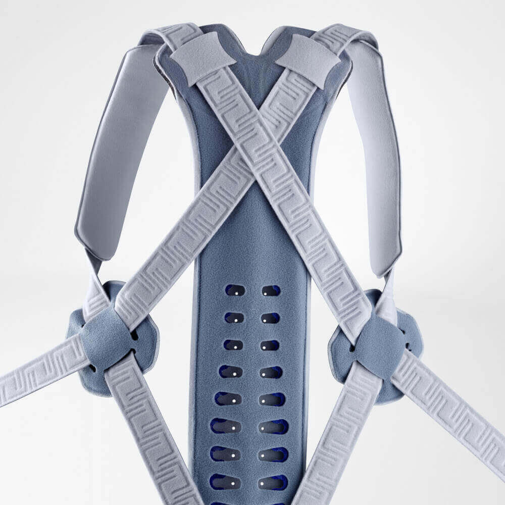 Si contraddistingue per la sua tripla azione: in primo luogo svolge un’azione di elongazione sulla parte superiore del corpo grazie a una lunga stecca in alluminio che segue la curvatura della colonna vertebrale, scarica il rachide toracico e lombare e ne corregge la postura, contrastando così la cifosi. In secondo luogo limita i movimenti con inclinazione laterale. In terzo luogo fornisce un impulso di elongazione al corpo, stimolandolo costantemente, a livello inconscio, l’assunzione autonoma di una postura corretta. Questo fa sì che la muscolatura della schiena conservi la sua forza il più a lungo possibile.