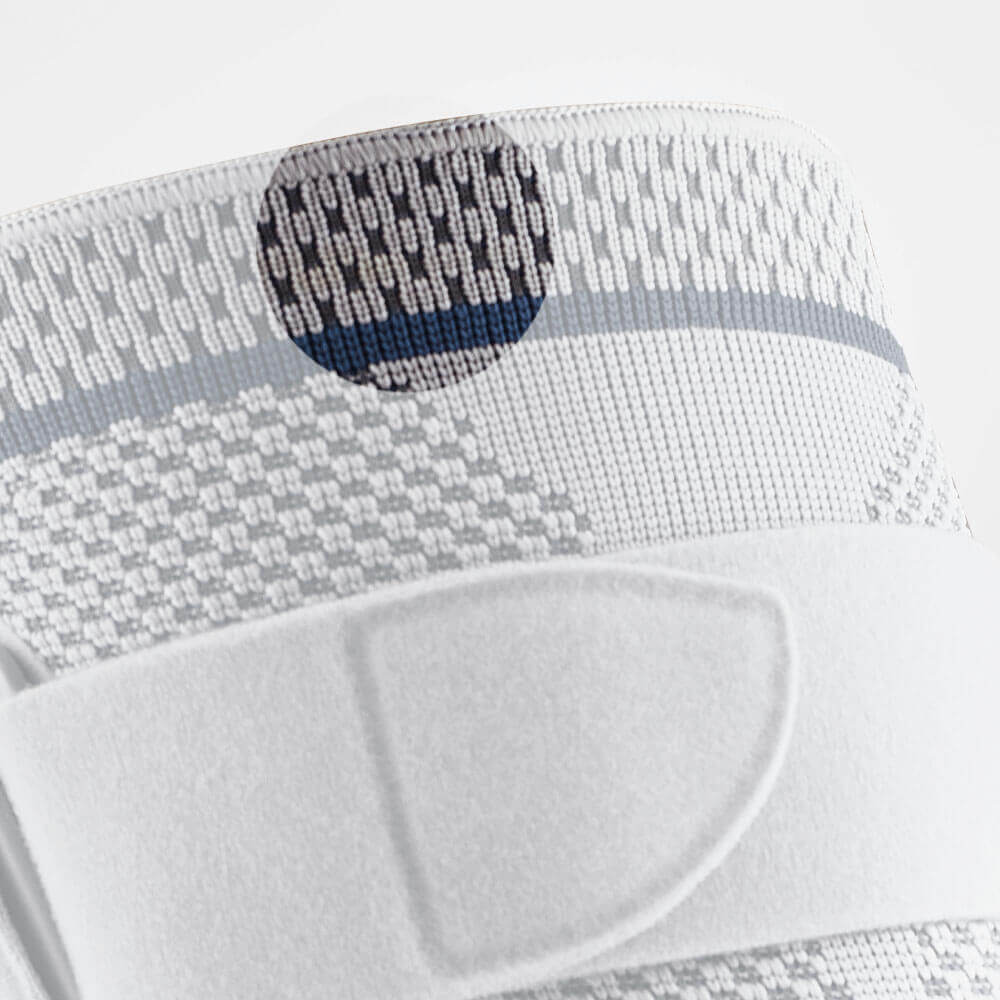 L'inserto viscoelastico integrato di forma anulare avvolge la rotula, mentre l'effetto combinato del tessuto a maglia e della pelotta fornisce un massaggio a compressione intermittente che attiva la muscolatura e accelera il processo di guarigione. La combinazione delle stecche articolari e del sistema di cinghie conferisce all'articolazione del ginocchio un maggior sostegno in modo passivo.